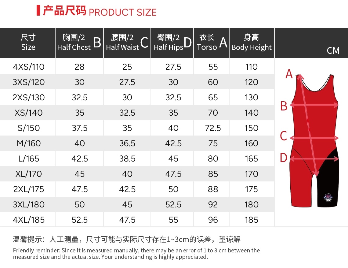 | Size | 4XS/110 or 3XS/120 or 2XS/130 or XS/140 or S/150 or M/160 or L/165 or XL/170 or 2XL/175 or 3XL/180 or 4XL/185 |